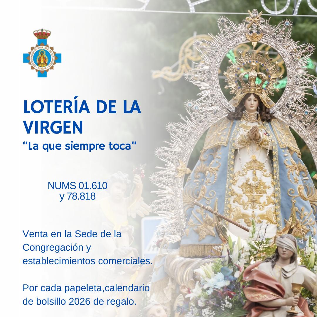 Ya está disponible la Lotería de la Virgen a la venta. Se encuentran en distintos establecimientos comerciales y en la sede de la Congregación: calle Sierra 25, bajo, los jueves de 19h a 21h. En los próximos días detallaremos los establecimientos comerciales donde se podrá adquirir la Lotería. También están ya a...